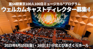 第64期東京100人100日ミュージカル®プログラムの本番公演を支えるブラックスピリッツ(舞台スタッフ)を募集します。 キャストの成長、輝き、真剣な眼差しを一番近くで見られるポジション、それが「ブラックスピリッツ」です。 […]
