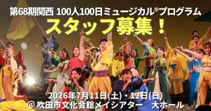 第68期関西100人100日ミュージカル®プログラムのスタッフ募集のお知らせです。 2025年1月の63期関西に続く、68期関西100人100日ミュージカル®︎プログラムを一緒に盛り上げていきましょう!まずは、熱くプログ […]