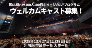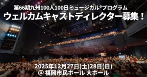 2026年7月開幕・10月公演の第70期九州100人100日ミュージカル®︎プログラムを中心となって創っていくコアスタッフ(プロデューサー/演出/キャストキャプテン)募集のお知らせです。 普段はなかなか出会わない、年齢も […]